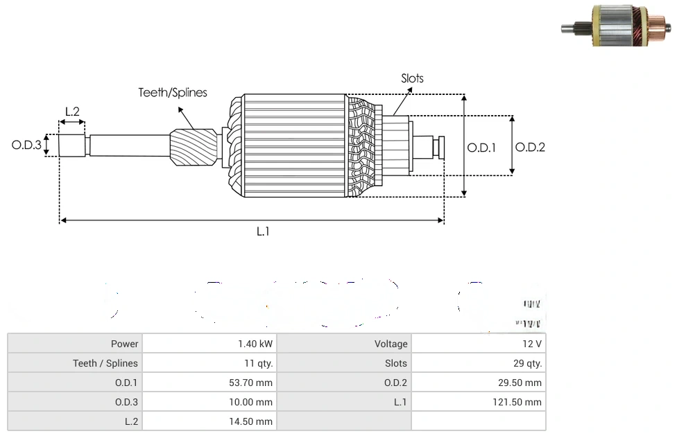 Starter armatures Power [ kW ] 1.40 Voltage [ V ] 12 Teeth / Splines [ qty. ] 11 Slots [ qty. ] 29 O.D.1 [ mm ] 53.70 O.D.2 [ mm ] 29.50 O.D.3 [ mm ] 10.00 L.1 [ mm ] 121.50 L.2 [ mm ] 14.50