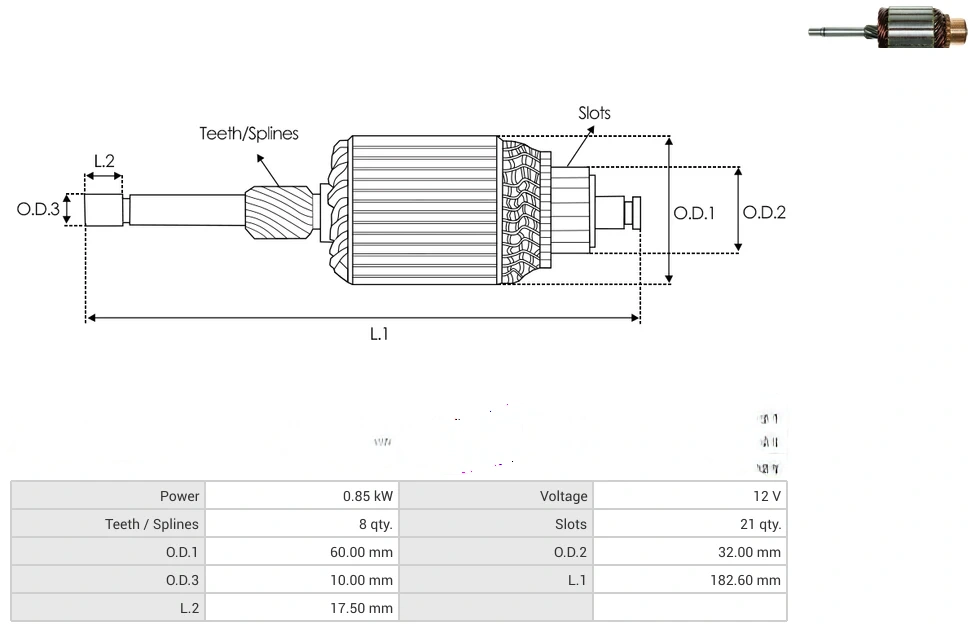 Starter armatures Power [ kW ] 0.85 Voltage [ V ] 12 Teeth / Splines [ qty. ] 8 Slots [ qty. ] 21 O.D.1 [ mm ] 60.00 O.D.2 [ mm ] 32.00 O.D.3 [ mm ] 10.00 L.1 [ mm ] 182.60 L.2 [ mm ] 17.50