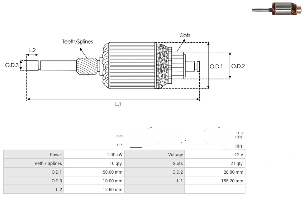 Starter armatures Power [ kW ] 1.00 Voltage [ V ] 12 Teeth / Splines [ qty. ] 10 Slots [ qty. ] 21 O.D.1 [ mm ] 50.00 O.D.2 [ mm ] 28.00 O.D.3 [ mm ] 10.00 L.1 [ mm ] 155.20 L.2 [ mm ] 12.50