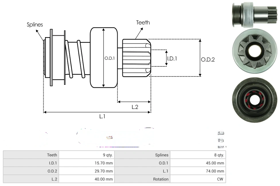 Starter drives Teeth [ qty. ] 9 Splines [ qty. ] 8 I.D.1 [ mm ] 15.70 O.D.1 [ mm ] 45.00 O.D.2 [ mm ] 29.70 L.1 [ mm ] 74.00 L.2 [ mm ] 40.00 Rotation CW