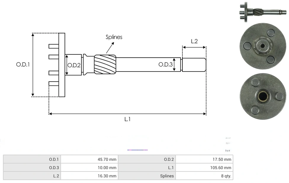 Starter gear shafts O.D.1 [ mm ] 45.70 O.D.2 [ mm ] 17.50 O.D.3 [ mm ] 10.00 L.1 [ mm ] 105.60 L.2 [ mm ] 16.30 Splines [ qty. ] 8