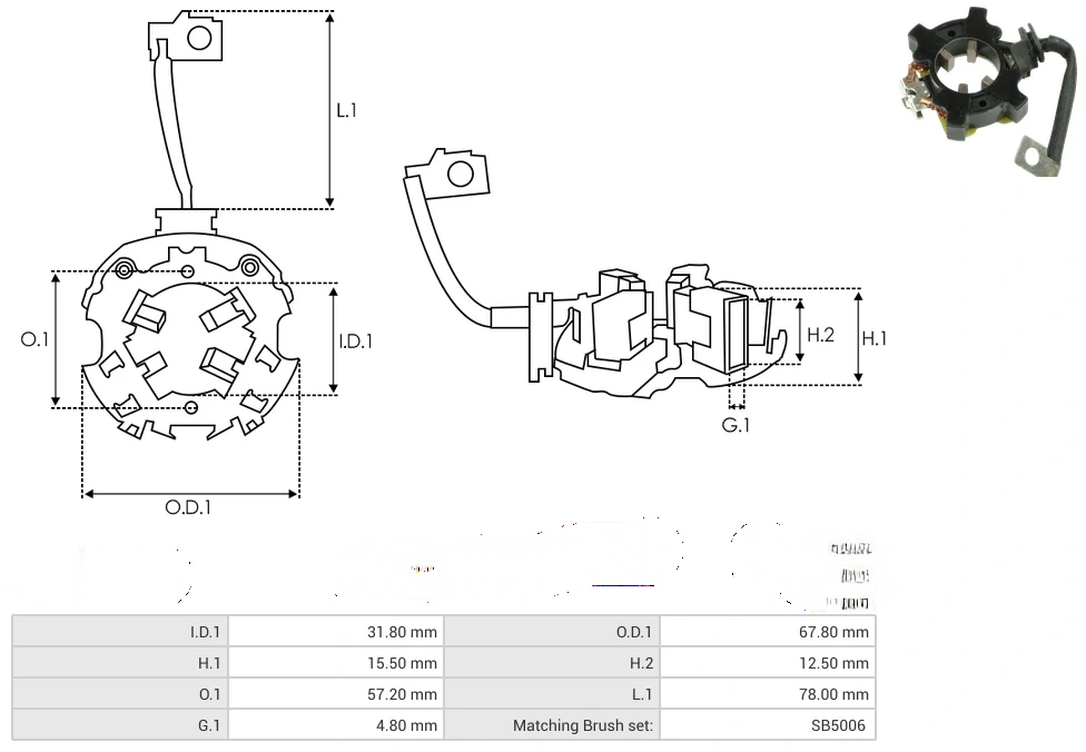 Starter brush holders I.D.1 [ mm ] 31.80 O.D.1 [ mm ] 67.80 H.1 [ mm ] 15.50 H.2 [ mm ] 12.50 O.1 [ mm ] 57.20 L.1 [ mm ] 78.00 G.1 [ mm ] 4.80