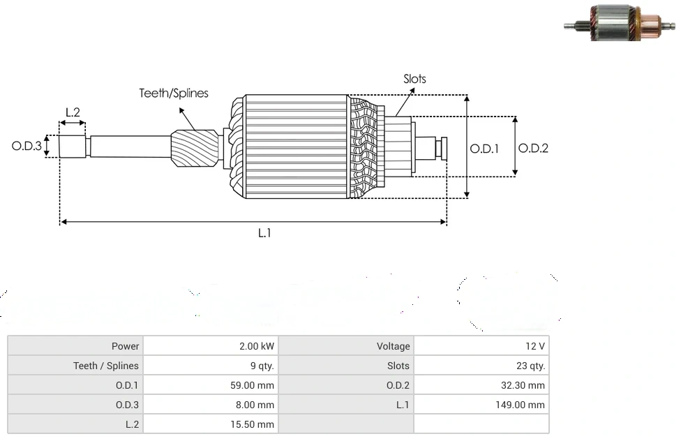 Starter armatures Power [ kW ] 2.00 Voltage [ V ] 12 Teeth / Splines [ qty. ] 9 Slots [ qty. ] 23 O.D.1 [ mm ] 59.00 O.D.2 [ mm ] 32.30 O.D.3 [ mm ] 8.00 L.1 [ mm ] 149.00 L.2 [ mm ] 15.50