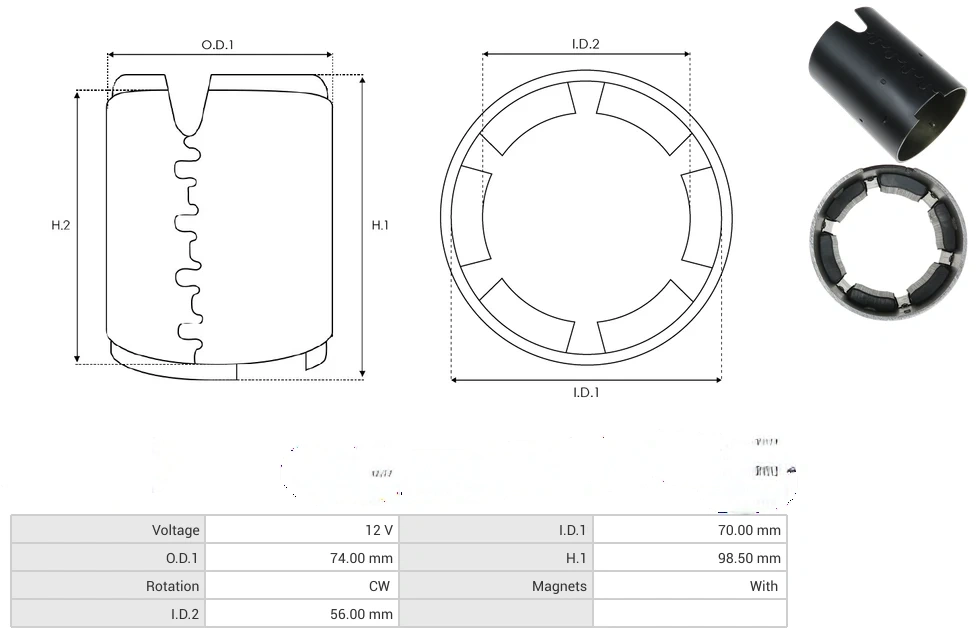 Starter yokes with magnets Voltage [ V ] 12 I.D.1 [ mm ] 70.00 O.D.1 [ mm ] 74.00 H.1 [ mm ] 98.50 Rotation CW Magnets With I.D.2 [ mm ] 56.00