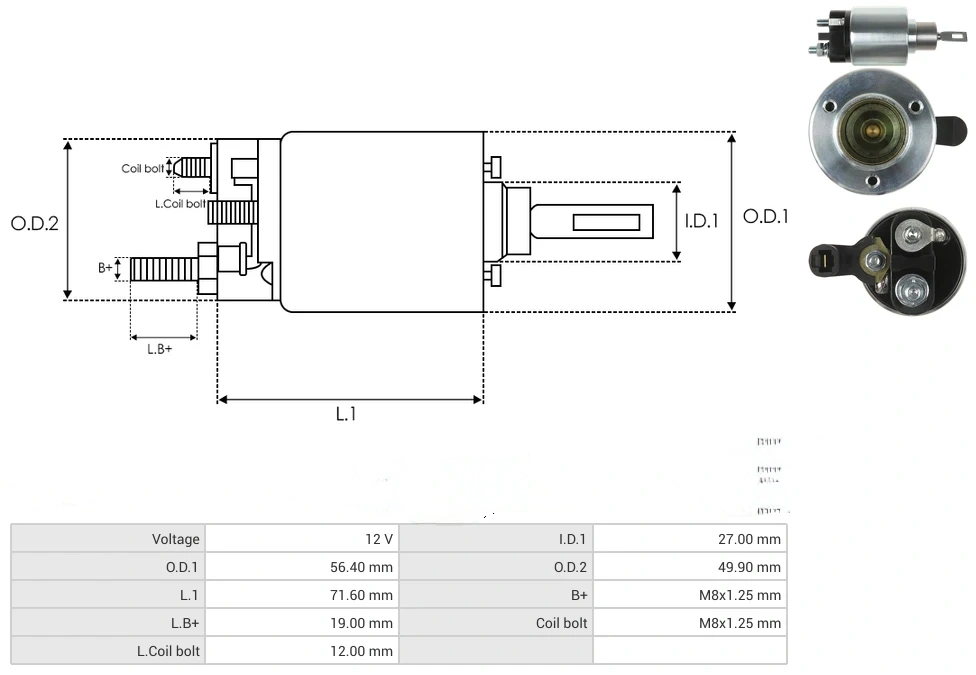Starter solenoids Voltage [ V ] 12 I.D.1 [ mm ] 27.00 O.D.1 [ mm ] 56.40 O.D.2 [ mm ] 49.90 L.1 [ mm ] 71.60 B+ [ mm ] M8x1.25 L.B+ [ mm ] 19.00 Coil bolt [ mm ] M8x1.25 L.Coil bolt [ mm ] 12.00