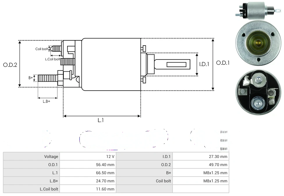 Starter solenoids Voltage [ V ] 12 I.D.1 [ mm ] 27.30 O.D.1 [ mm ] 56.40 O.D.2 [ mm ] 49.70 L.1 [ mm ] 66.50 B+ [ mm ] M8x1.25 L.B+ [ mm ] 24.70 Coil bolt [ mm ] M8x1.25 L.Coil bolt [ mm ] 11.60