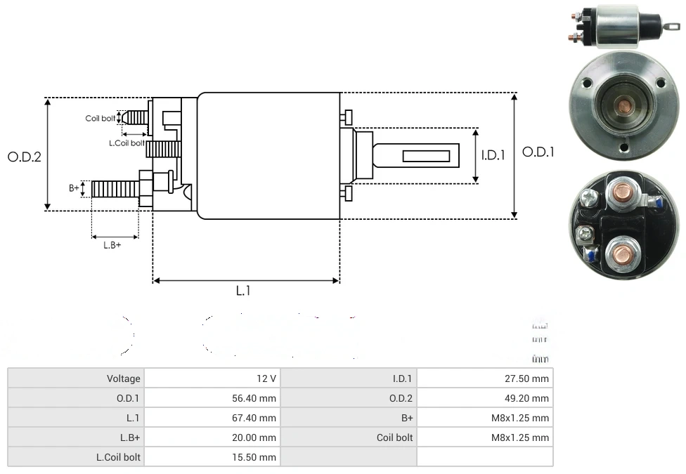 Starter solenoids Voltage [ V ] 12 I.D.1 [ mm ] 27.50 O.D.1 [ mm ] 56.40 O.D.2 [ mm ] 49.20 L.1 [ mm ] 67.40 B+ [ mm ] M8x1.25 L.B+ [ mm ] 20.00 Coil bolt [ mm ] M8x1.25 L.Coil bolt [ mm ] 15.50
