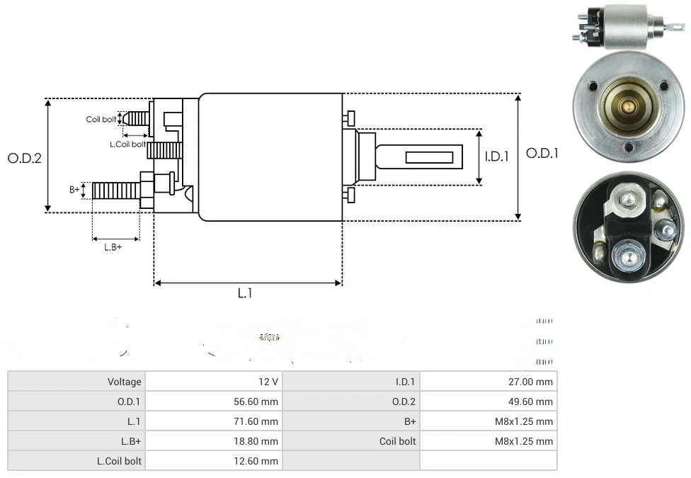 Starter solenoids Voltage [ V ] 12 I.D.1 [ mm ] 27.00 O.D.1 [ mm ] 56.60 O.D.2 [ mm ] 49.60 L.1 [ mm ] 71.60 B+ [ mm ] M8x1.25 L.B+ [ mm ] 18.80 Coil bolt [ mm ] M8x1.25 L.Coil bolt [ mm ] 12.60