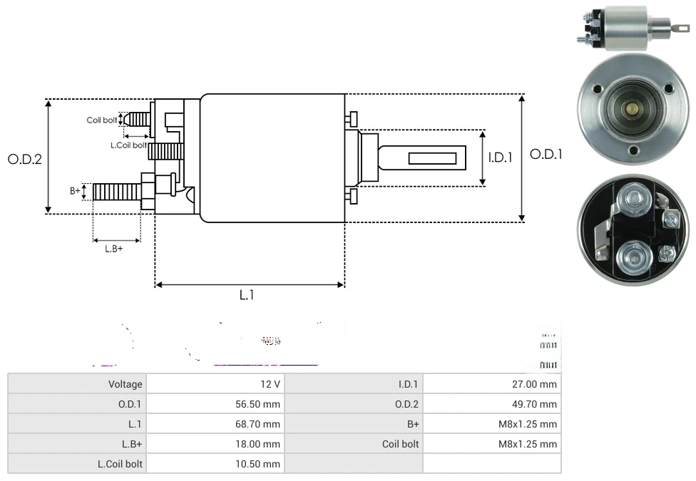 Starter solenoids Voltage [ V ] 12 I.D.1 [ mm ] 27.00 O.D.1 [ mm ] 56.50 O.D.2 [ mm ] 49.70 L.1 [ mm ] 68.70 B+ [ mm ] M8x1.25 L.B+ [ mm ] 18.00 Coil bolt [ mm ] M8x1.25 L.Coil bolt [ mm ] 10.50
