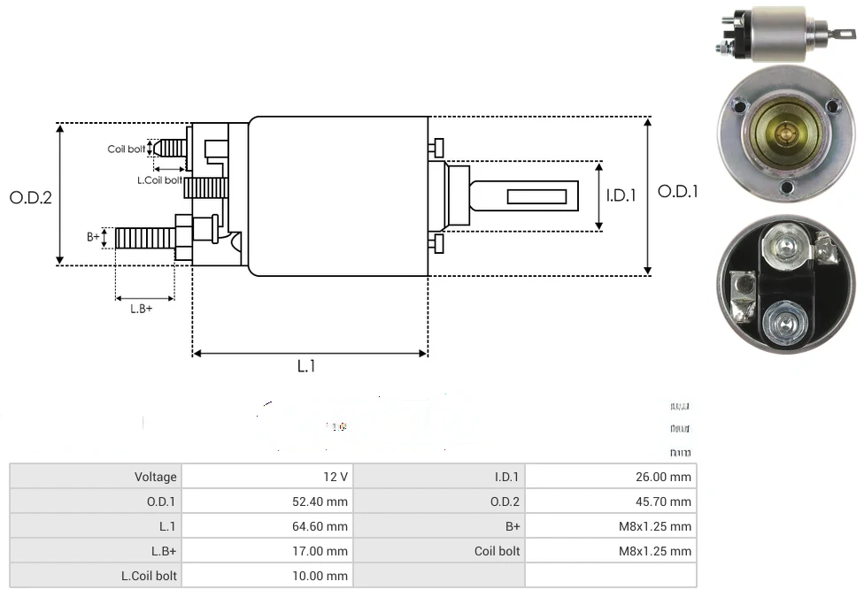 Starter solenoids Voltage [ V ] 12 I.D.1 [ mm ] 26.00 O.D.1 [ mm ] 52.40 O.D.2 [ mm ] 45.70 L.1 [ mm ] 64.60 B+ [ mm ] M8x1.25 L.B+ [ mm ] 17.00 Coil bolt [ mm ] M8x1.25 L.Coil bolt [ mm ] 10.00
