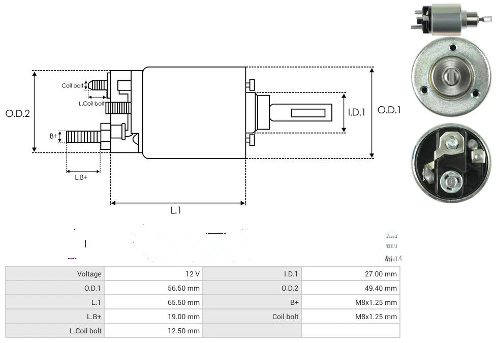Starter solenoids Voltage [ V ] 12 I.D.1 [ mm ] 27.00 O.D.1 [ mm ] 56.50 O.D.2 [ mm ] 49.40 L.1 [ mm ] 65.50 B+ [ mm ] M8x1.25 L.B+ [ mm ] 19.00 Coil bolt [ mm ] M8x1.25 L.Coil bolt [ mm ] 12.50