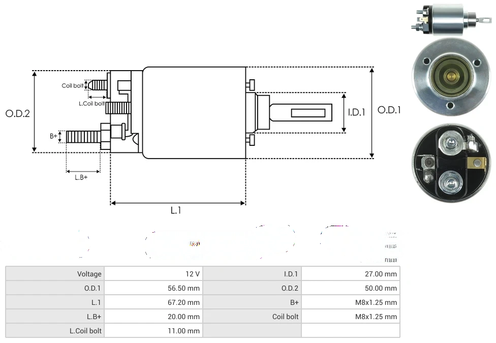 Starter solenoids Voltage [ V ] 12 I.D.1 [ mm ] 27.00 O.D.1 [ mm ] 56.50 O.D.2 [ mm ] 50.00 L.1 [ mm ] 67.20 B+ [ mm ] M8x1.25 L.B+ [ mm ] 20.00 Coil bolt [ mm ] M8x1.25 L.Coil bolt [ mm ] 11.00