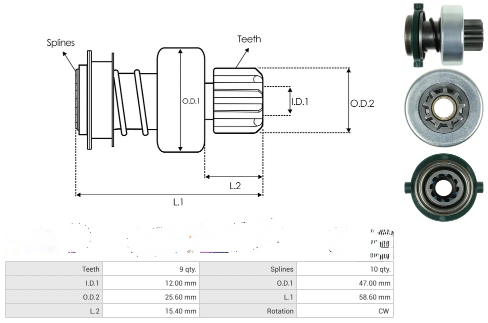 Starter drives Teeth [ qty. ] 9 Splines [ qty. ] 10 I.D.1 [ mm ] 12.00 O.D.1 [ mm ] 47.00 O.D.2 [ mm ] 25.60 L.1 [ mm ] 58.60 L.2 [ mm ] 15.40 Rotation CW