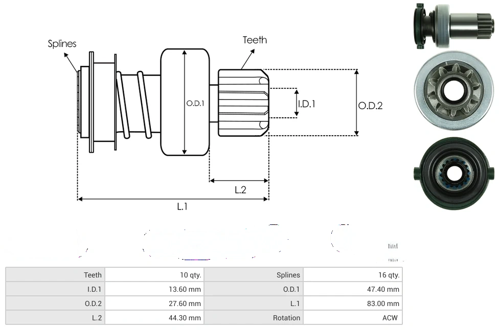 Starter drives Teeth [ qty. ] 10 Splines [ qty. ] 16 I.D.1 [ mm ] 13.60 O.D.1 [ mm ] 47.40 O.D.2 [ mm ] 27.60 L.1 [ mm ] 83.00 L.2 [ mm ] 44.30 Rotation ACW