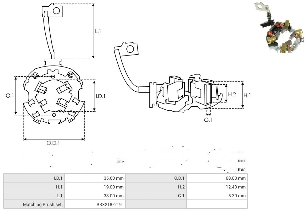 Starter brush holders I.D.1 [ mm ] 35.60 O.D.1 [ mm ] 68.00 H.1 [ mm ] 19.00 H.2 [ mm ] 12.40 L.1 [ mm ] 38.00 G.1 [ mm ] 5.30