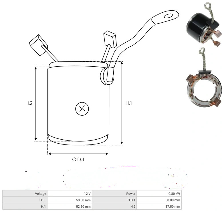 Starter yokes with field coils Voltage [ V ] 12 Power [ kW ] 0.80 I.D.1 [ mm ] 58.00 O.D.1 [ mm ] 68.00 H.1 [ mm ] 52.50 H.2 [ mm ] 37.50