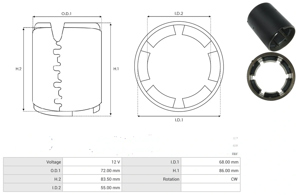 Starter yokes with magnets Voltage [ V ] 12 I.D.1 [ mm ] 68.00 O.D.1 [ mm ] 72.00 H.1 [ mm ] 86.00 H.2 [ mm ] 83.50 Rotation CW I.D.2 [ mm ] 55.00
