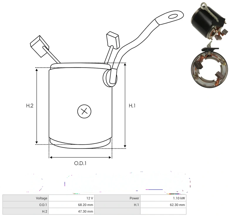 Starter yokes with field coils Voltage [ V ] 12 Power [ kW ] 1.10 O.D.1 [ mm ] 68.20 H.1 [ mm ] 62.30 H.2 [ mm ] 47.30