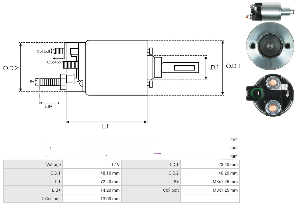 Starter solenoids Voltage [ V ] 12 I.D.1 [ mm ] 23.40 O.D.1 [ mm ] 48.10 O.D.2 [ mm ] 46.20 L.1 [ mm ] 72.20 B+ [ mm ] M8x1.25 L.B+ [ mm ] 14.20 Coil bolt [ mm ] M8x1.25 L.Coil bolt [ mm ] 13.00