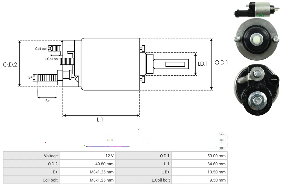 Starter solenoids Voltage [ V ] 12 O.D.1 [ mm ] 50.00 O.D.2 [ mm ] 49.80 L.1 [ mm ] 64.60 B+ [ mm ] M8x1.25 L.B+ [ mm ] 13.50 Coil bolt [ mm ] M8x1.25 L.Coil bolt [ mm ] 9.50