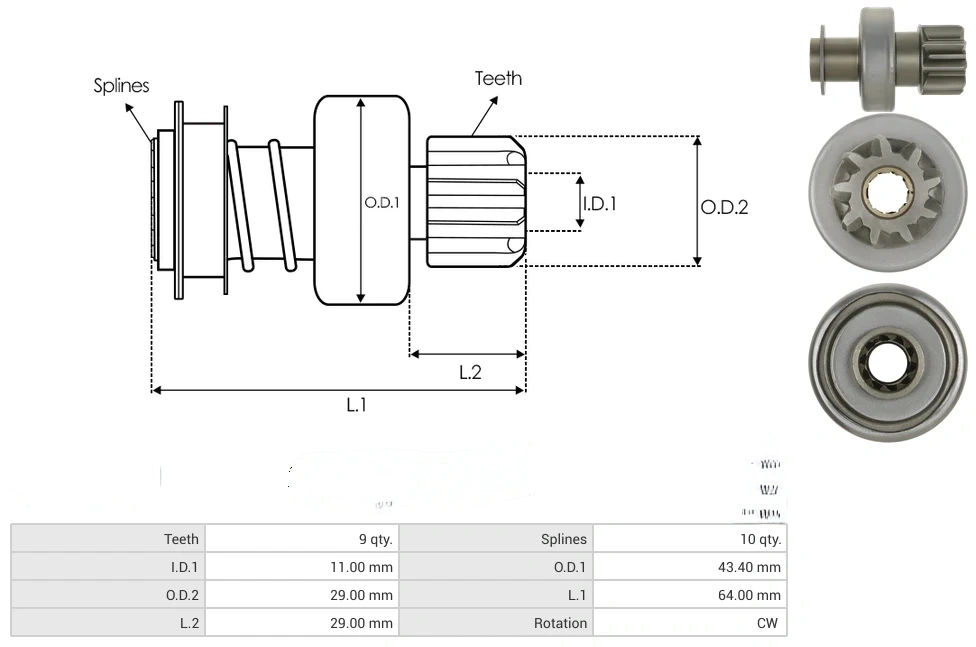 Starter drives Teeth [ qty. ] 9 Splines [ qty. ] 10 I.D.1 [ mm ] 11.00 O.D.1 [ mm ] 43.40 O.D.2 [ mm ] 29.00 L.1 [ mm ] 64.00 L.2 [ mm ] 29.00 Rotation CW