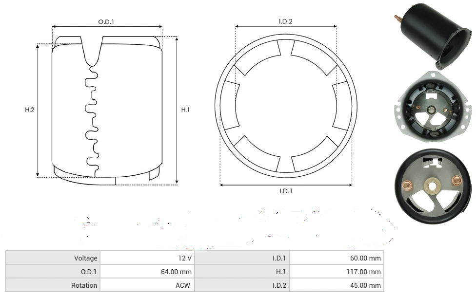 Starter yokes with magnets Voltage [ V ] 12 I.D.1 [ mm ] 60.00 O.D.1 [ mm ] 64.00 H.1 [ mm ] 117.00 Rotation ACW I.D.2 [ mm ] 45.00
