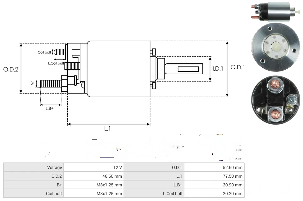 Starter solenoids Voltage [ V ] 12 O.D.1 [ mm ] 52.60 O.D.2 [ mm ] 46.60 L.1 [ mm ] 77.50 B+ [ mm ] M8x1.25 L.B+ [ mm ] 20.90 Coil bolt [ mm ] M8x1.25 L.Coil bolt [ mm ] 20.20