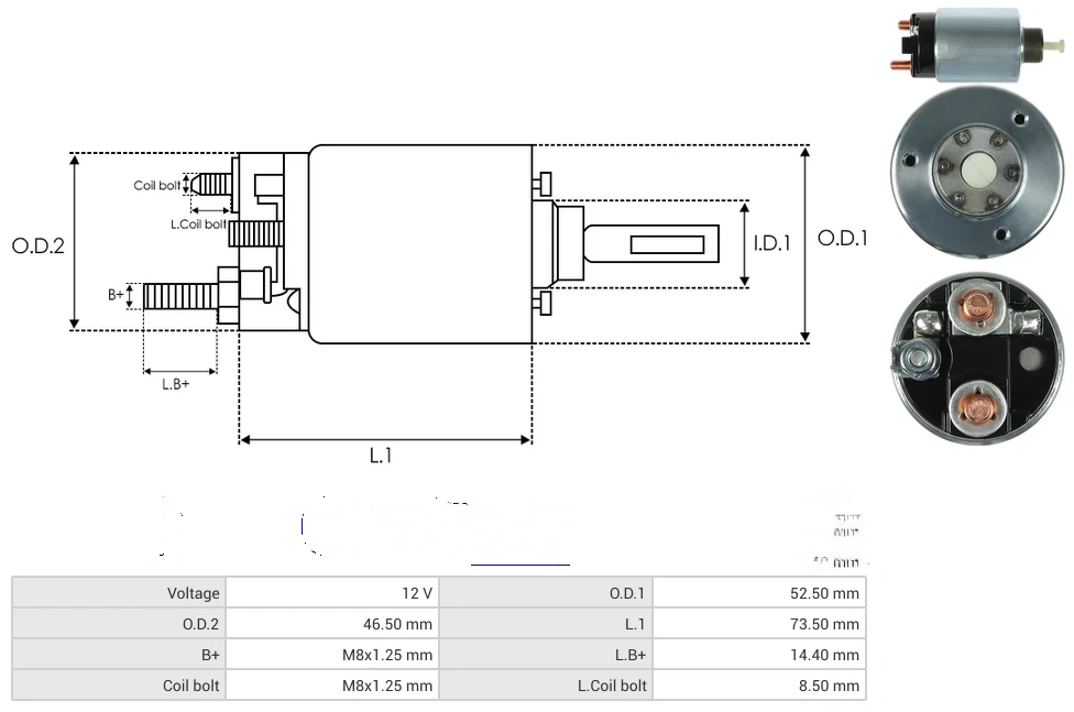 Starter solenoids Voltage [ V ] 12 O.D.1 [ mm ] 52.50 O.D.2 [ mm ] 46.50 L.1 [ mm ] 73.50 B+ [ mm ] M8x1.25 L.B+ [ mm ] 14.40 Coil bolt [ mm ] M8x1.25 L.Coil bolt [ mm ] 8.50