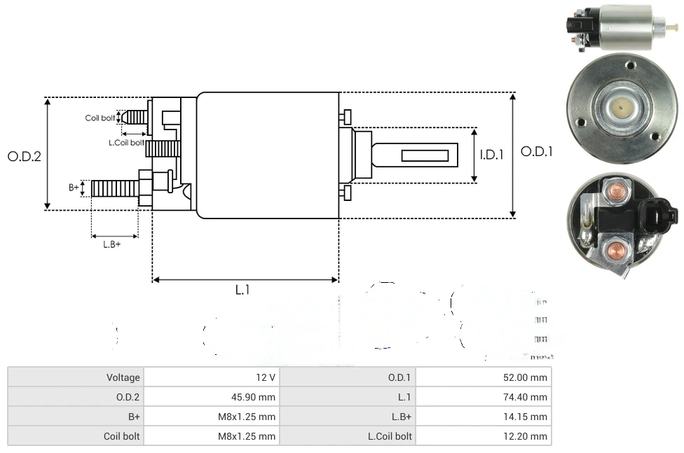 Starter solenoids Voltage [ V ] 12 O.D.1 [ mm ] 52.00 O.D.2 [ mm ] 45.90 L.1 [ mm ] 74.40 B+ [ mm ] M8x1.25 L.B+ [ mm ] 14.15 Coil bolt [ mm ] M8x1.25 L.Coil bolt [ mm ] 12.20