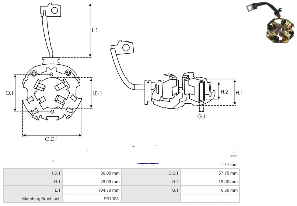Starter brush holders I.D.1 [ mm ] 36.00 O.D.1 [ mm ] 57.75 H.1 [ mm ] 28.00 H.2 [ mm ] 19.00 L.1 [ mm ] 104.70 G.1 [ mm ] 6.60