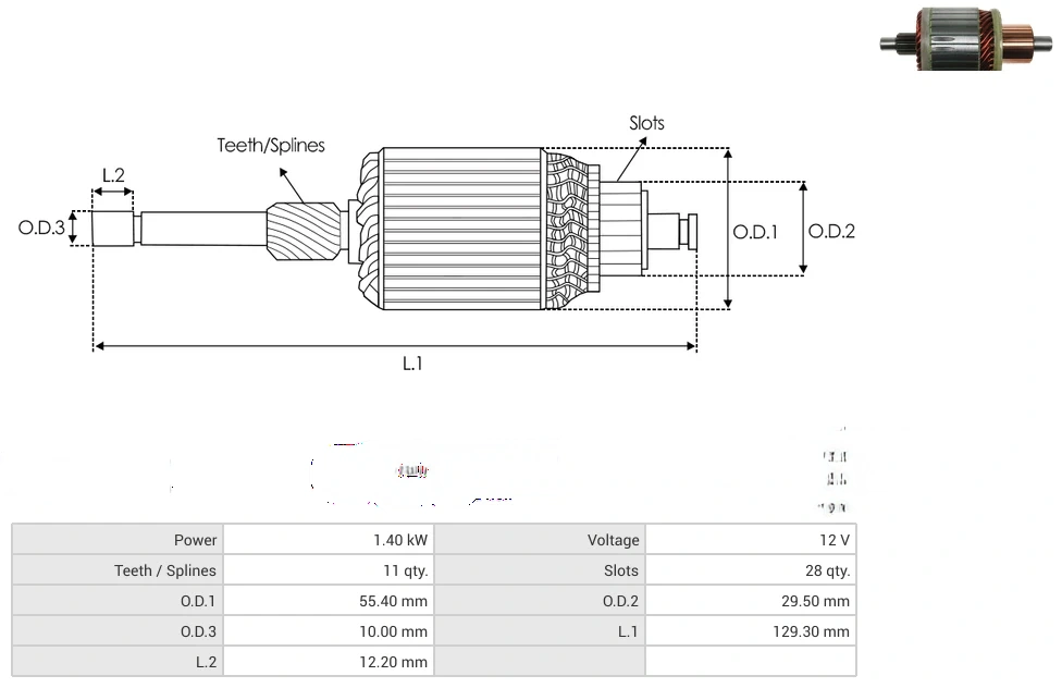 Starter armatures Power [ kW ] 1.40 Voltage [ V ] 12 Teeth / Splines [ qty. ] 11 Slots [ qty. ] 28 O.D.1 [ mm ] 55.40 O.D.2 [ mm ] 29.50 O.D.3 [ mm ] 10.00 L.1 [ mm ] 129.30 L.2 [ mm ] 12.20