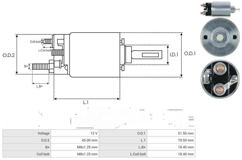 Starter solenoids Voltage [ V ] 12 O.D.1 [ mm ] 51.50 O.D.2 [ mm ] 45.00 L.1 [ mm ] 79.50 B+ [ mm ] M8x1.25 L.B+ [ mm ] 18.40 Coil bolt [ mm ] M8x1.25 L.Coil bolt [ mm ] 18.40