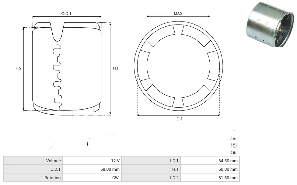 Starter yokes with magnets Voltage [ V ] 12 I.D.1 [ mm ] 64.50 O.D.1 [ mm ] 68.00 H.1 [ mm ] 60.00 Rotation CW I.D.2 [ mm ] 51.50