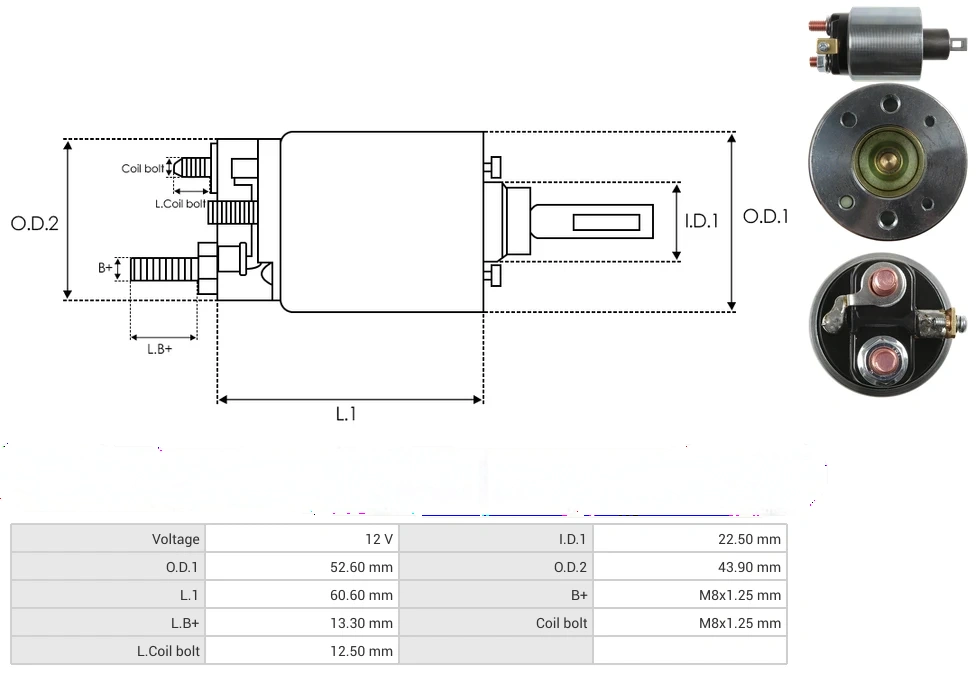 Starter solenoids Voltage [ V ] 12 I.D.1 [ mm ] 22.50 O.D.1 [ mm ] 52.60 O.D.2 [ mm ] 43.90 L.1 [ mm ] 60.60 B+ [ mm ] M8x1.25 L.B+ [ mm ] 13.30 Coil bolt [ mm ] M8x1.25 L.Coil bolt [ mm ] 12.50