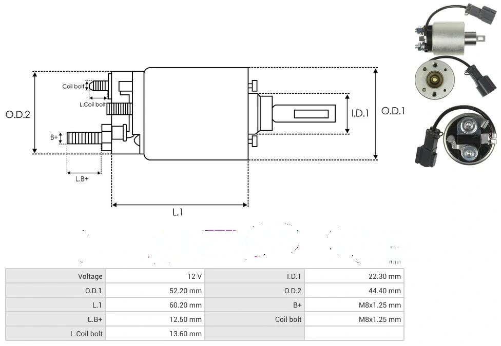 Starter solenoids Voltage [ V ] 12 I.D.1 [ mm ] 22.30 O.D.1 [ mm ] 52.20 O.D.2 [ mm ] 44.40 L.1 [ mm ] 60.20 B+ [ mm ] M8x1.25 L.B+ [ mm ] 12.50 Coil bolt [ mm ] M8x1.25 L.Coil bolt [ mm ] 13.60
