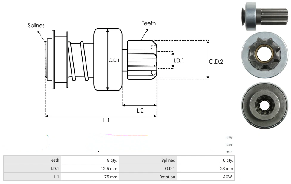 Starter drives Teeth [ qty. ] 8 Splines [ qty. ] 10 I.D.1 [ mm ] 12.5 O.D.1 [ mm ] 28 L.1 [ mm ] 75 Rotation ACW