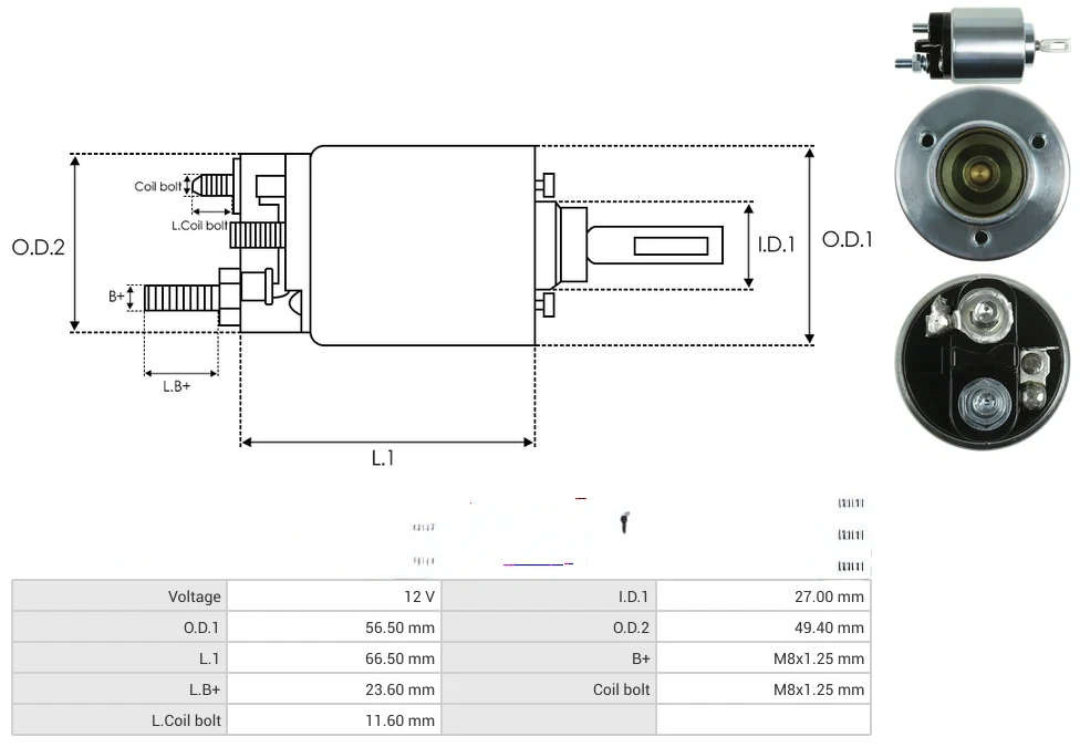 Starter solenoids Voltage [ V ] 12 I.D.1 [ mm ] 27.00 O.D.1 [ mm ] 56.50 O.D.2 [ mm ] 49.40 L.1 [ mm ] 66.50 B+ [ mm ] M8x1.25 L.B+ [ mm ] 23.60 Coil bolt [ mm ] M8x1.25 L.Coil bolt [ mm ] 11.60