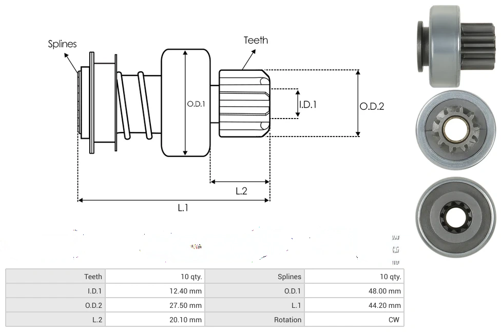 Starter drives Teeth [ qty. ] 10 Splines [ qty. ] 10 I.D.1 [ mm ] 12.40 O.D.1 [ mm ] 48.00 O.D.2 [ mm ] 27.50 L.1 [ mm ] 44.20 L.2 [ mm ] 20.10 Rotation CW