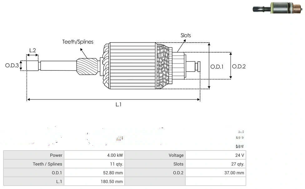 Starter armatures Power [ kW ] 4.00 Voltage [ V ] 24 Teeth / Splines [ qty. ] 11 Slots [ qty. ] 27 O.D.1 [ mm ] 52.80 O.D.2 [ mm ] 37.00 L.1 [ mm ] 180.50