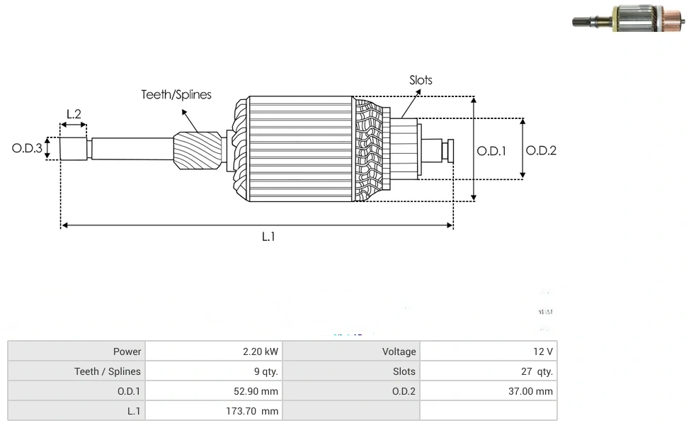 Starter armatures Power [ kW ] 2.20 Voltage [ V ] 12 Teeth / Splines [ qty. ] 9 Slots [ qty. ] 27 O.D.1 [ mm ] 52.90 O.D.2 [ mm ] 37.00 L.1 [ mm ] 173.70