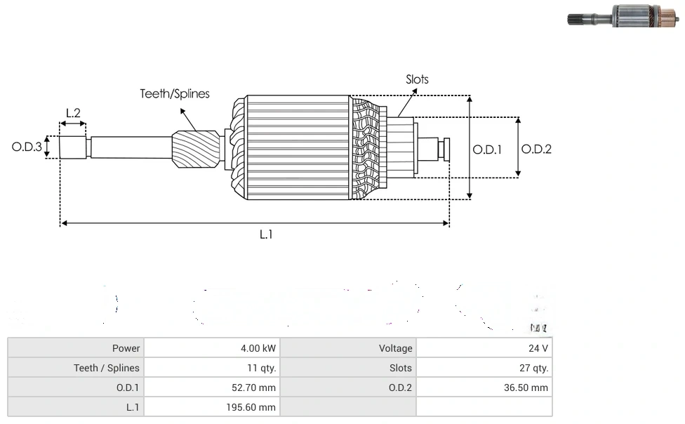 Starter armatures Power [ kW ] 4.00 Voltage [ V ] 24 Teeth / Splines [ qty. ] 11 Slots [ qty. ] 27 O.D.1 [ mm ] 52.70 O.D.2 [ mm ] 36.50 L.1 [ mm ] 195.60