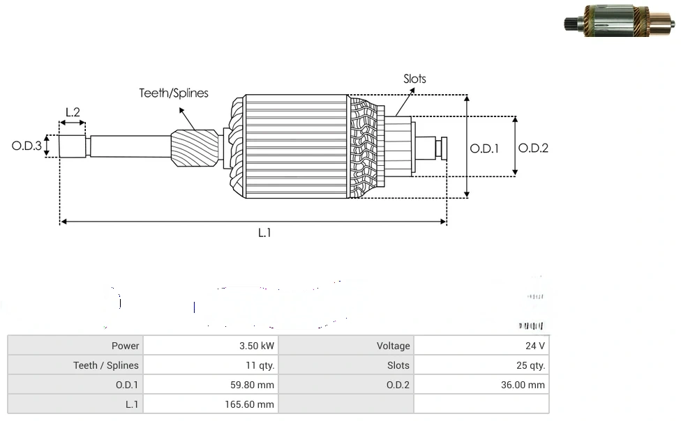 Starter armatures Power [ kW ] 3.50 Voltage [ V ] 24 Teeth / Splines [ qty. ] 11 Slots [ qty. ] 25 O.D.1 [ mm ] 59.80 O.D.2 [ mm ] 36.00 L.1 [ mm ] 165.60