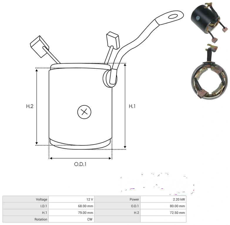 Starter yokes with field coils Voltage [ V ] 12 Power [ kW ] 2.20 I.D.1 [ mm ] 68.00 O.D.1 [ mm ] 80.00 H.1 [ mm ] 79.00 H.2 [ mm ] 72.50 Rotation CW