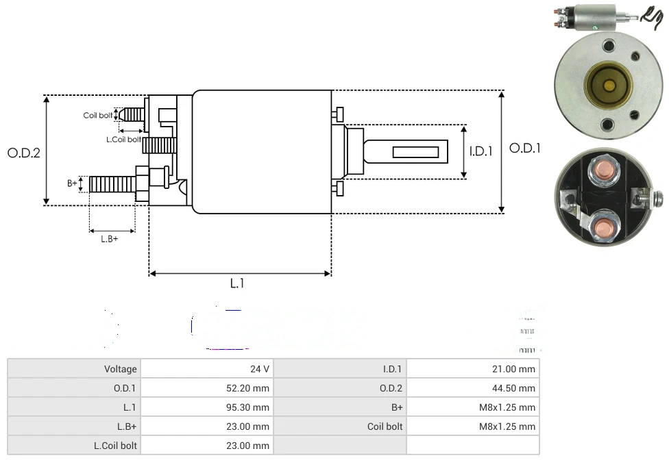 Starter solenoids Voltage [ V ] 24 I.D.1 [ mm ] 21.00 O.D.1 [ mm ] 52.20 O.D.2 [ mm ] 44.50 L.1 [ mm ] 95.30 B+ [ mm ] M8x1.25 L.B+ [ mm ] 23.00 Coil bolt [ mm ] M8x1.25 L.Coil bolt [ mm ] 23.00