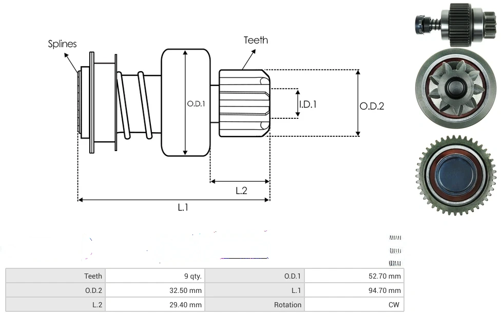 Starter drives Teeth [ qty. ] 9 O.D.1 [ mm ] 52.70 O.D.2 [ mm ] 32.50 L.1 [ mm ] 94.70 L.2 [ mm ] 29.40 Rotation CW