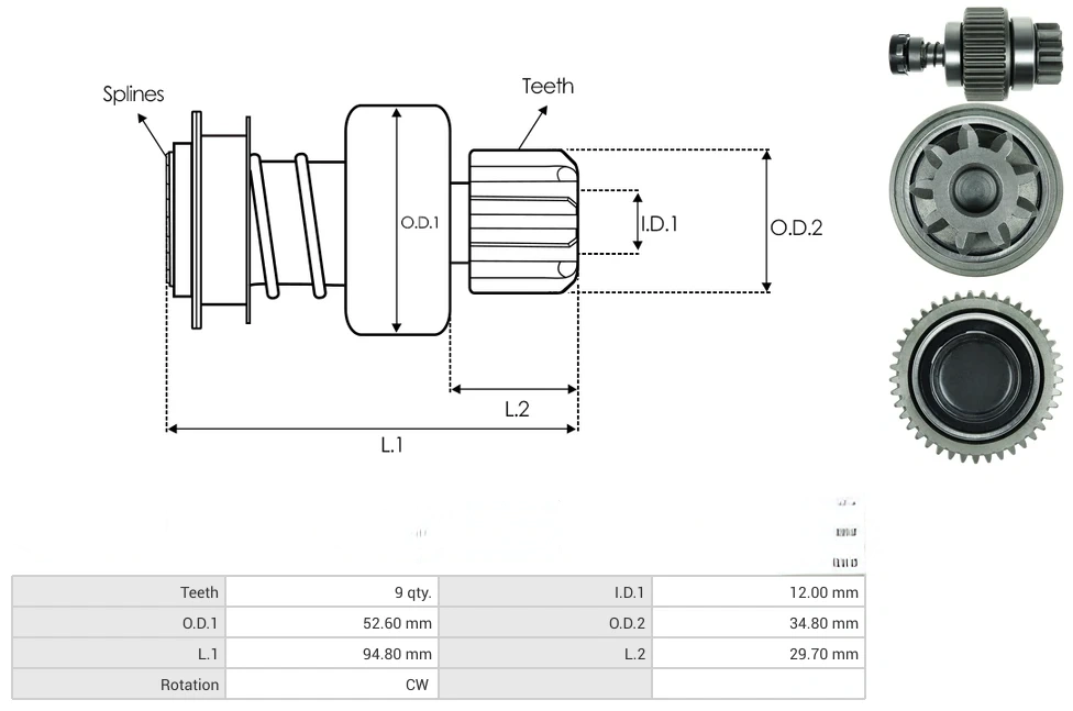 Starter drives Teeth [ qty. ] 9 I.D.1 [ mm ] 12.00 O.D.1 [ mm ] 52.60 O.D.2 [ mm ] 34.80 L.1 [ mm ] 94.80 L.2 [ mm ] 29.70 Rotation CW