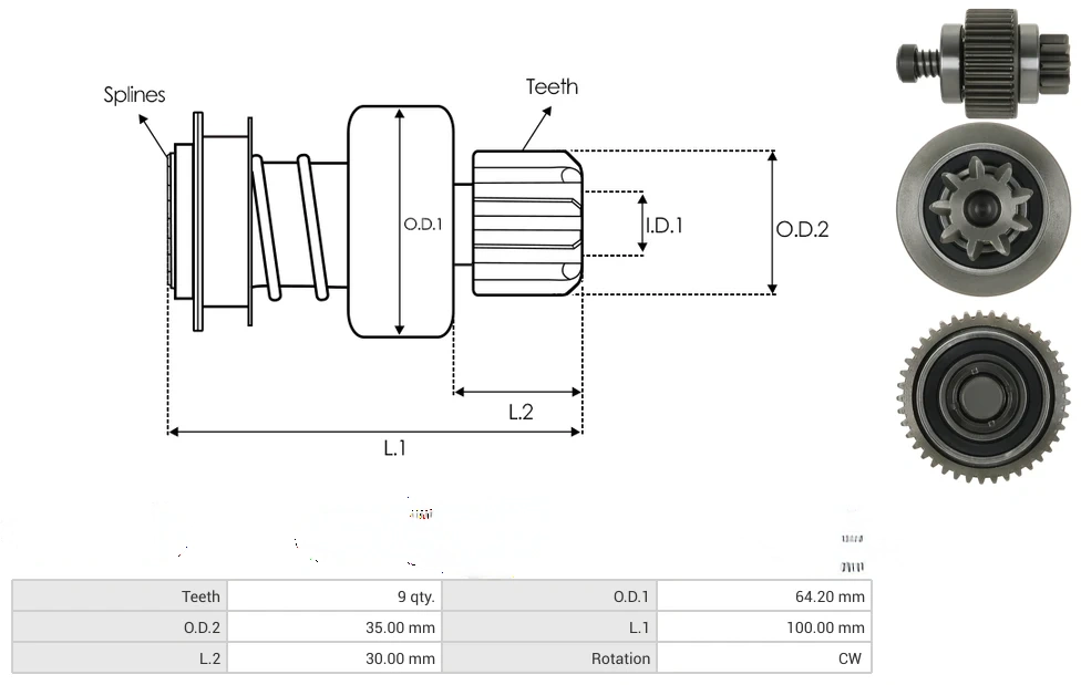Starter drives Teeth [ qty. ] 9 O.D.1 [ mm ] 64.20 O.D.2 [ mm ] 35.00 L.1 [ mm ] 100.00 L.2 [ mm ] 30.00 Rotation CW
