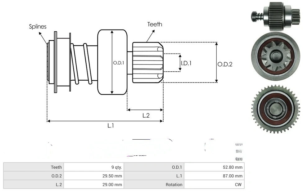 Starter drives Teeth [ qty. ] 9 O.D.1 [ mm ] 52.80 O.D.2 [ mm ] 29.50 L.1 [ mm ] 87.00 L.2 [ mm ] 29.00 Rotation CW