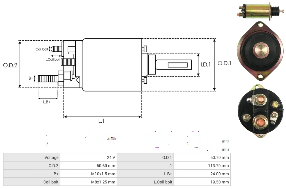 Starter solenoids Voltage [ V ] 24 O.D.1 [ mm ] 60.70 O.D.2 [ mm ] 60.60 L.1 [ mm ] 113.70 B+ [ mm ] M10x1.5 L.B+ [ mm ] 24.00 Coil bolt [ mm ] M8x1.25 L.Coil bolt [ mm ] 19.50