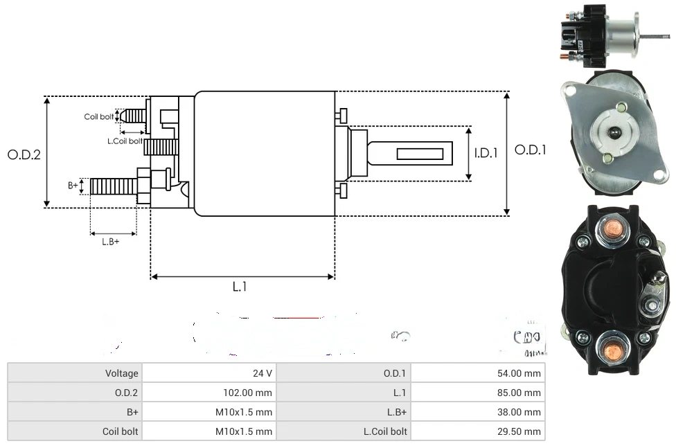 Starter solenoids Voltage [ V ] 24 O.D.1 [ mm ] 54.00 O.D.2 [ mm ] 102.00 L.1 [ mm ] 85.00 B+ [ mm ] M10x1.5 L.B+ [ mm ] 38.00 Coil bolt [ mm ] M10x1.5 L.Coil bolt [ mm ] 29.50